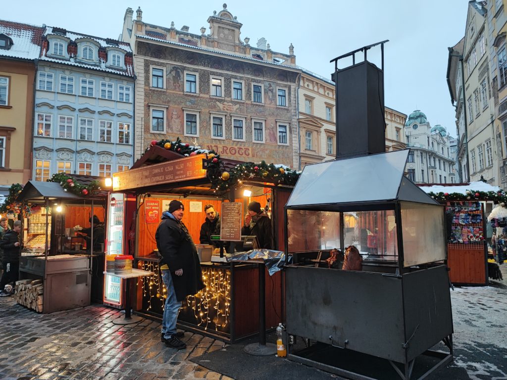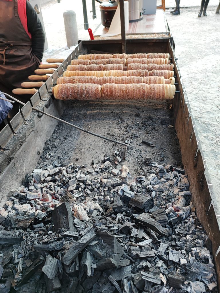 Nei mercatini di Václavské náměstí (Piazza Venceslao, che abbiamo frequentato più e più volte, avendo prenotato un appartamento che vi si affacciava) si trovano soprattutto cose da mangiare: il prosciutto che viene cotto alla brace a fuoco lento, le salsicce, il formaggio grigliato (unica alternativa per vegetariani), contorni vari inondati d’olio, patatine fritte e il celebre trdlo, cotto alla brace e poi avvolto in uno strato di zucchero e mandorle. Per far scendere giù tutto questo cibo, bicchieri e bicchieri di vin brulè (o succo di mele caldo per i bambini) e, ovviamente, un pivo di birra. La scelta di bere la birra fredda a -7°C è certamente personale, ma noi abbiamo preferito un confortevole vin brulè (con cui ci siamo assicurati un po’ di calore, almeno fino al bicchiere successivo).