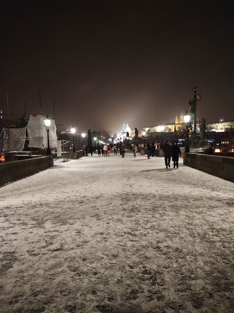 Il Ponte Carlo è molto più bello al crepuscolo o meglio ancora la mattina presto, quando non c’è gente. Di giorno è disseminato di artisti di strada e caricaturisti che offrono le loro opere ai turisti e di comitive che fanno la foto mentre toccano la base della Statua di San Giovanni (si dice sia un portafortuna o un modo per garantirsi di tornare a Praga). A noi il Ponte si è presentato come in un film in bianco e nero, con il tracciato latteo della neve e lo sfondo nero delle statue deserte. E vi dirò, dopo il bagno di folla questa cartolina old style l’ho davvero apprezzata.
