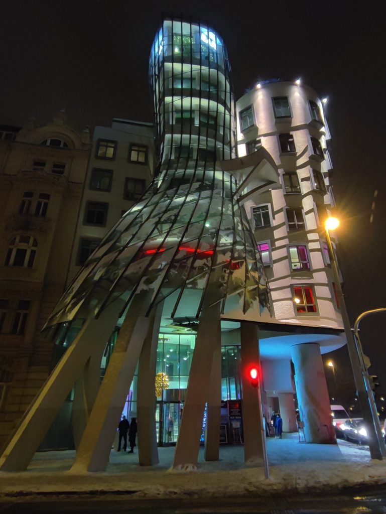 L’ultima sera (di giorno si lavora, l’ho detto), con una temperatura di poco superiore a quella della domenica, andiamo un po’ a goderci altri luoghi della città, evitando le strade affollate e percorrendo sentieri ciottolosi con luce fioca. La prima tappa è la Tančící dům (casa danzante), conosciuta anche come Ginger e Fred, edificio ballerino che sembra ondeggiare di fronte alla Moldava. Sul rooftop c’è un bar da cui si gode una bellissima vista: il Castello vi farà sempre orientare con grande facilità, da qualunque punto vi troviate.